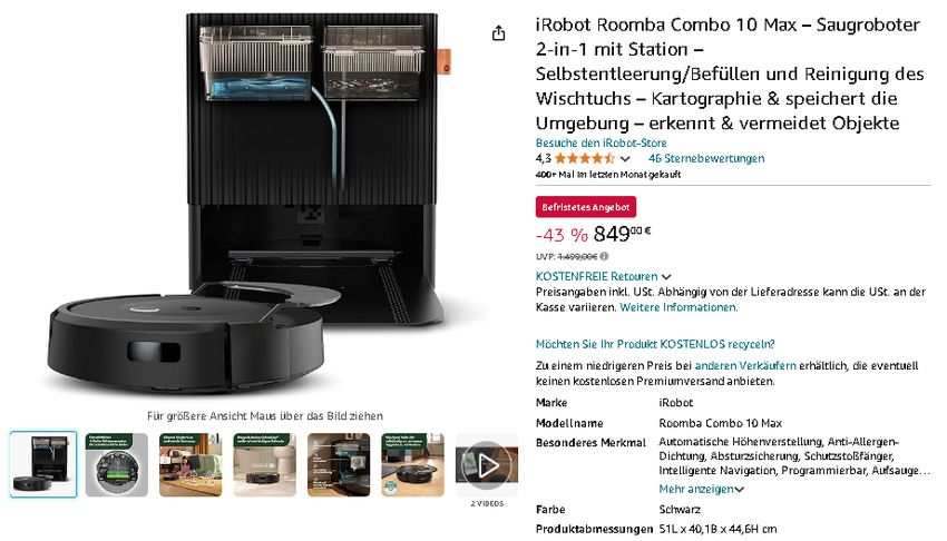 Der iRobot Roomba Combo 10 Max ist derzeit für 849,00 € erhältlich, reduziert von 1.499,00 € - das sind sensationelle 43% Rabatt! Eine Ersparnis von ganzen 650€, die Ihren Geldbeutel und Ihre Böden gleichermaßen schonen wird.
