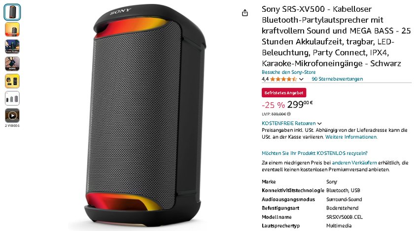 Der vielseitige Sony SRS-XV500 Bluetooth-Lautsprecher ist aktuell für 299,00 € erhältlich, reduziert von 399,00 € - das entspricht einem großzügigen Rabatt von 25%! Ein Angebot, das Musik in den Ohren aller Soundenthusiasten ist.