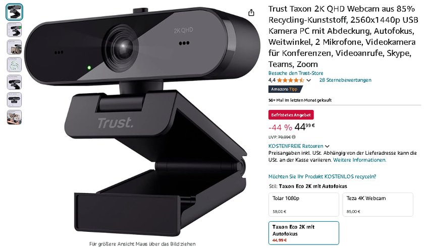 Sichern Sie sich die Trust Taxon 2K QHD Webcam zu einem unschlagbaren Preis auf Amazon.de