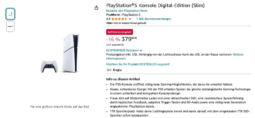 Die PlayStation 5 Digital Edition (Slim) ist jetzt für 379,00 € erhältlich, reduziert von 449,99 € - das sind satte 16% Rabatt! Ein Angebot, das Ihre Gaming-Träume in greifbare Nähe rückt.