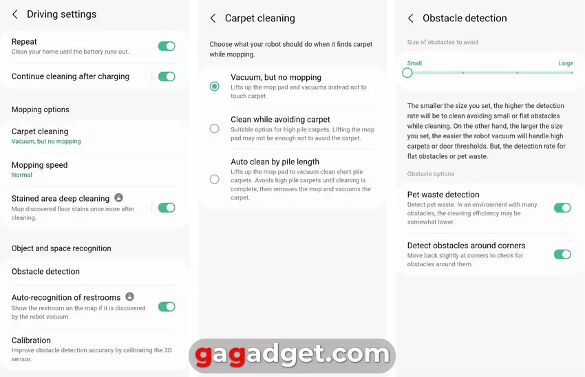 In den Einstellungen der Anwendung können Sie die Verhaltensweisen des Roboters während der Arbeit wählen. Ob er bis zum Ende der Akkuladung arbeiten soll und ob er nach dem Aufladen zur Reinigung zurückkehren soll, wenn er keine Zeit hatte, sie zu beenden. Sie können auch Aktionen für Teppiche einstellen: nur Trockenreinigung oder einfach die Reinigung beenden, sobald die Räder den Teppich berühren. Es ist auch möglich, die Hinderniserkennung einzustellen: ob jedes kleine Objekt erkannt oder ignoriert werden soll (mit 4 Stufen der Ermessensauswahl).