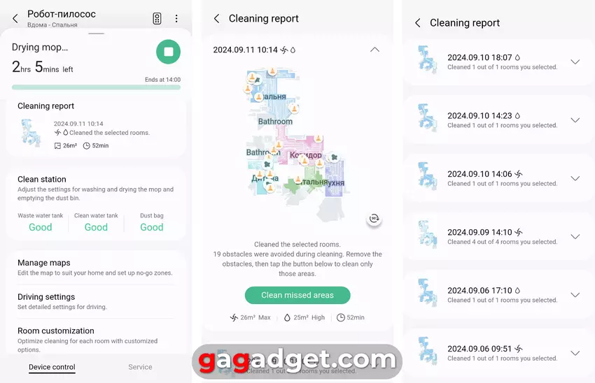 Natürlich gibt es auch Einstellungen für die Nassreinigung. Es ist möglich, festzulegen (Standardeinstellungen sind hier überall zu sehen), wie oft die Nassreinigungsdüsen gewaschen werden sollen. Nach einer bestimmten Zeit zur Reinigungsstation zurückzukehren oder die Tücher einmal pro Raum zu waschen. Lassen Sie die Station jedes Mal, wenn sie zur Station zurückkehrt, Staub aus dem robotereigenen Behälter saugen, oder tun Sie es gelegentlich (Sie können kein Intervall angeben - das Wort "periodisch" steht buchstäblich da drin). Sie können auch die Trocknungszeit der Düse festlegen - von 2 bis 4 Stunden.