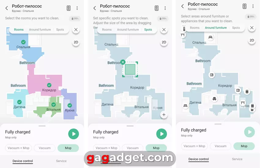 Aber das ist noch nicht alles. Sie können eine von drei Reinigungsoptionen auswählen - komplette Reinigung von Räumen (standardmäßig alle auf einmal, aber Sie können einzelne oder sogar einen Raum auswählen). Zusätzlich können Sie um die Möbel herum reinigen oder in einem vom Benutzer ausgewählten Bereich (grünes Viereck) reinigen.