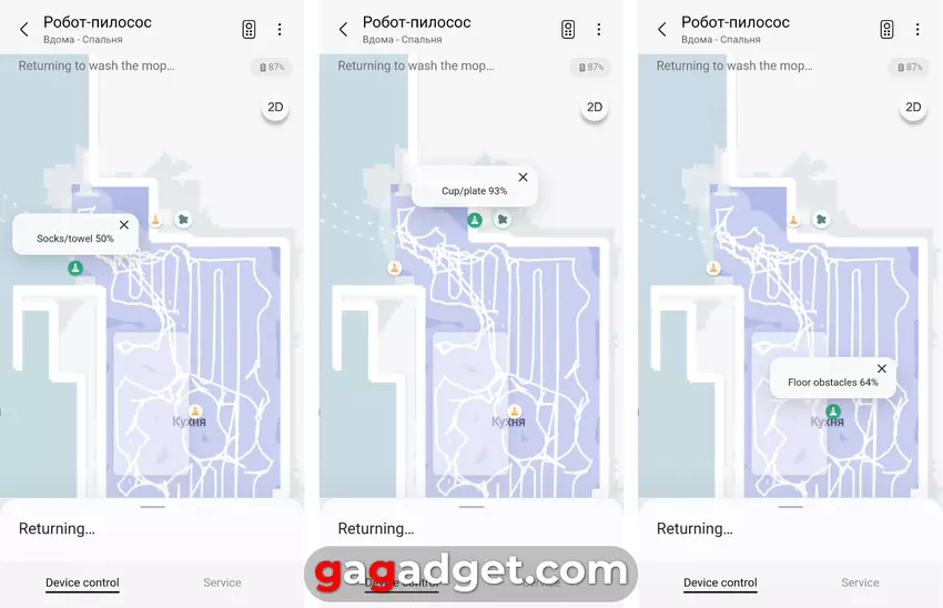 Das Gerät ist so gut in der Navigation, dass es sogar versucht, Objekte zu identifizieren, die es bei seiner Arbeit stören. Und es scheut sich nicht einmal, dem Benutzer dies mitzuteilen (wenn auch noch nicht immer genau). Dies hebt das Gerät auf eine neue technologische Ebene. Die Qualität der Trockenreinigung wirft überhaupt keine Fragen auf, aber die Nassreinigung erhält nur 4 von 5 Sternen, weil wir auf den glücklichen Moment warten, in dem der Staubsaugerroboter in der Lage sein wird, auch mit eingetrockneten Flecken auf dem Boden zu kämpfen. Und er wird von der Kategorie der Geräte, die das Haus sauber halten, in die Kategorie eines kompletten Reinigungszyklus übergehen, nach dem der Mensch überhaupt nichts mehr zu tun hat (es wird immer noch notwendig sein, das Wasser in den Tanks und Staubbeuteln zu wechseln, aber "britische Wissenschaftler" arbeiten bereits an diesem Problem).