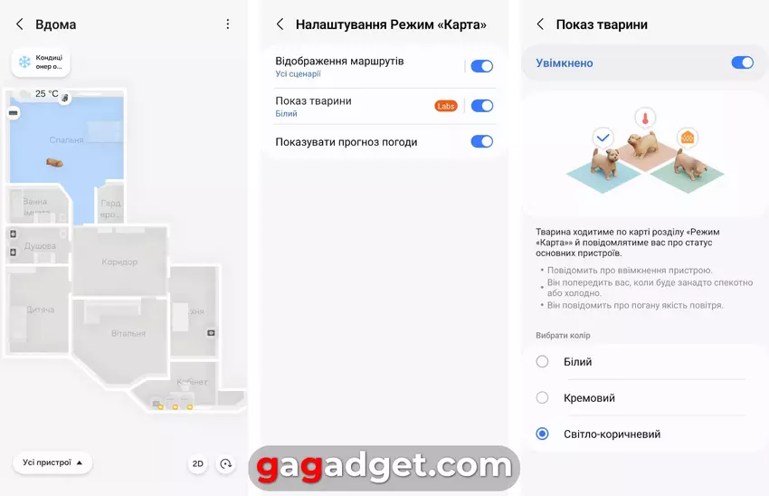 Es ist eigentlich seltsam, dass der Roboter nicht die Karte der Wohnung verwendet, die ich bereits sorgfältig in der SmartThings-App erstellt habe. In der neuesten Version hat er übrigens einen virtuellen Hund, der alle Räume der Reihe nach inspiziert und Komforttipps gibt. Das macht Spaß.