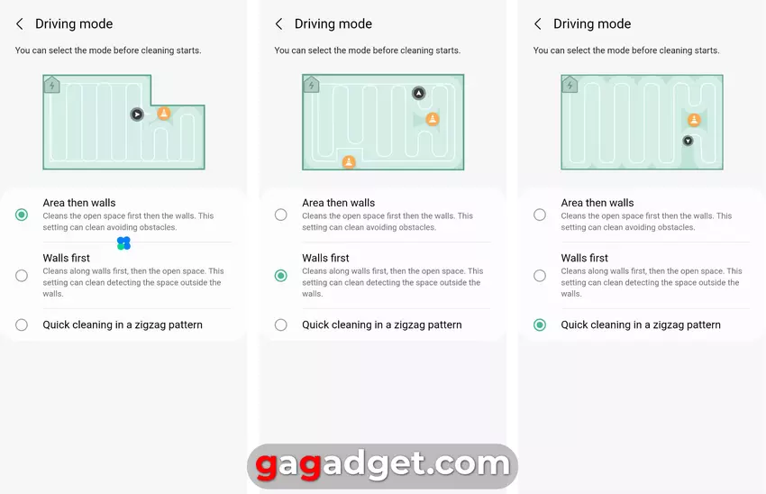 Der Samsung Jet Bot Combo AI verfügt über drei Reinigungsmodi: trocken, nass und trocken+nass gleichzeitig (wenn sowohl der Sauger als auch die Tücher für die Nassreinigung arbeiten - er arbeitet schnell, braucht aber auch mehr Energie). Theoretisch gibt es noch eine vierte Option - wenn Sie zuerst die Trocken- und dann die Nassreinigung des Raums programmieren. Und Sie können einen von drei Reinigungsalgorithmen wählen. Bei der ersten Option reinigt der Roboter den Raum und fährt dann unter den Wänden hindurch. Bei der zweiten Variante beginnt er an den Wänden, fährt um den Raum herum und reinigt dann den Raum. Im dritten Fall bewegt er sich einfach im Zickzack (die schnellste Variante).