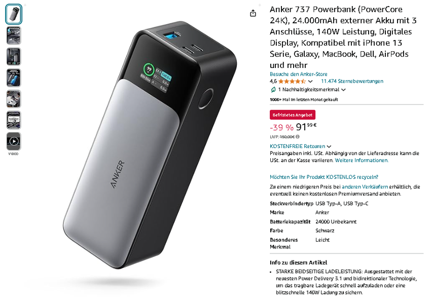 Die Anker 737 Powerbank ist jetzt für 91,99 € erhältlich, heruntergesetzt von 150,00 €. Das bedeutet, Sie sparen unglaubliche 39% oder 58€! Ein Angebot, das Ihren Geräten und Ihrem Geldbeutel gleichermaßen Energie verleiht!