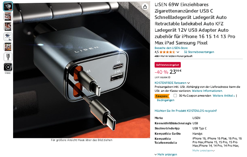 Das LISEN 69W Autoladegerät ist jetzt für 23,99 € erhältlich, heruntergesetzt von 39,99 €. Das bedeutet, Sie sparen satte 40% oder 16€! Ein Angebot, das Ihre Fahrt und Ihren Geldbeutel gleichermaßen auflädt!
