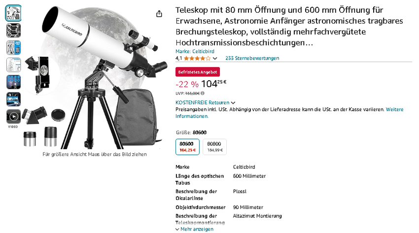 Das Celticbird Teleskop ist aktuell für 104,25 € erhältlich, reduziert vom UVP von 133,00 € - das entspricht einer Ersparnis von 28,75 €! Ein Angebot, das Astronomie-Enthusiasten begeistern wird.