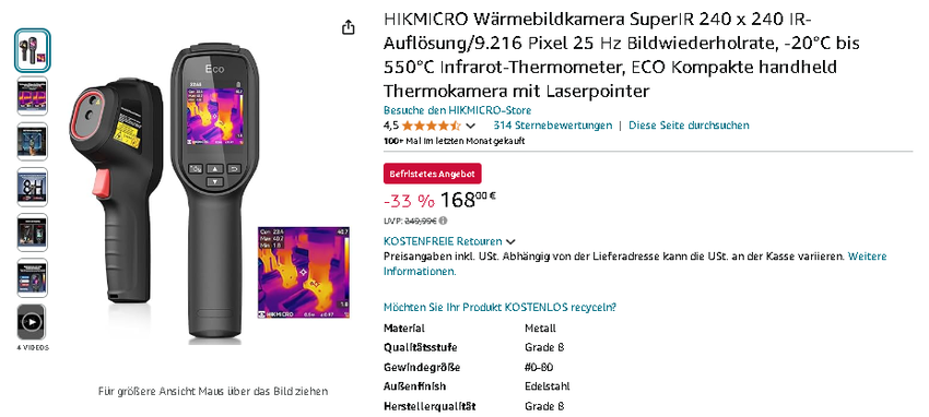 Die innovative HIKMICRO Wärmebildkamera ist aktuell für 168,00 € erhältlich, reduziert von 249,99 € - das entspricht einer Ersparnis von 33%! Ein Angebot, das Profis und Heimwerker gleichermaßen begeistern wird.