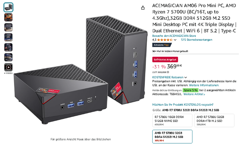 Der innovative ACEMAGICIAN AM06 Pro Mini PC ist aktuell für 369,99 € erhältlich, reduziert von 539,99 € - das entspricht einer Ersparnis von 31%! Ein Angebot, das Technikbegeisterte und Profis gleichermaßen begeistern wird.