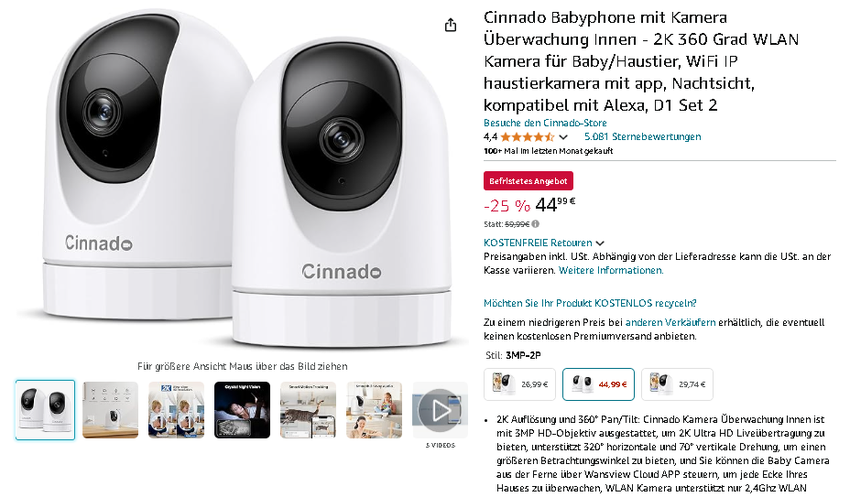 Das innovative Cinnado Babyphone mit Kamera ist aktuell für 44,99 € erhältlich, reduziert von 59,99 € - das entspricht einer Ersparnis von 25%! Ein Angebot, das Eltern und Sicherheitsbewusste gleichermaßen begeistern wird.