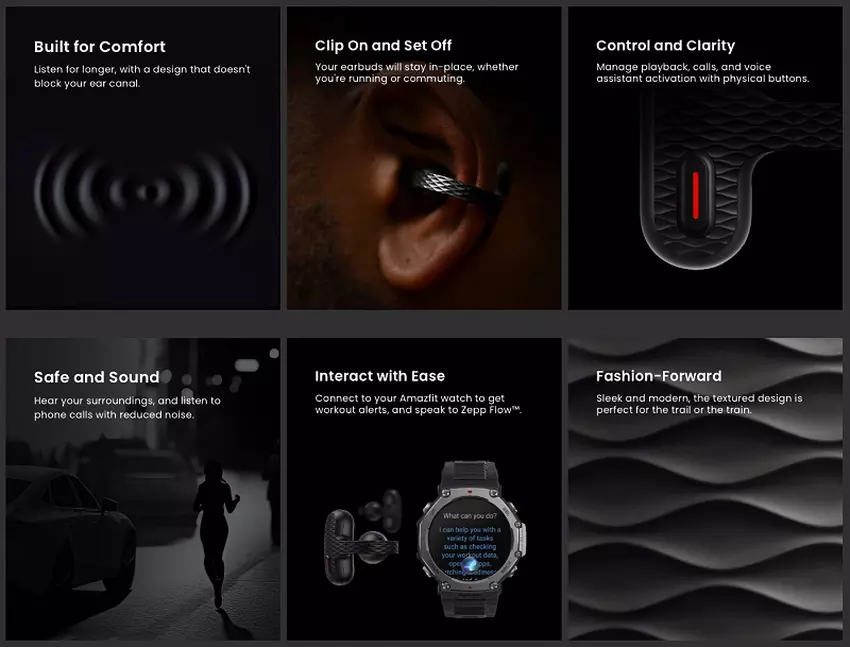 Amazfit Up hat ein Clip-on-Design, das das Ohr nicht bedeckt. Die Ohrhörer nutzen KI, um Hintergrundgeräusche bei Anrufen zu reduzieren und die Lautstärke und Klarheit des Klangs zu erhöhen.