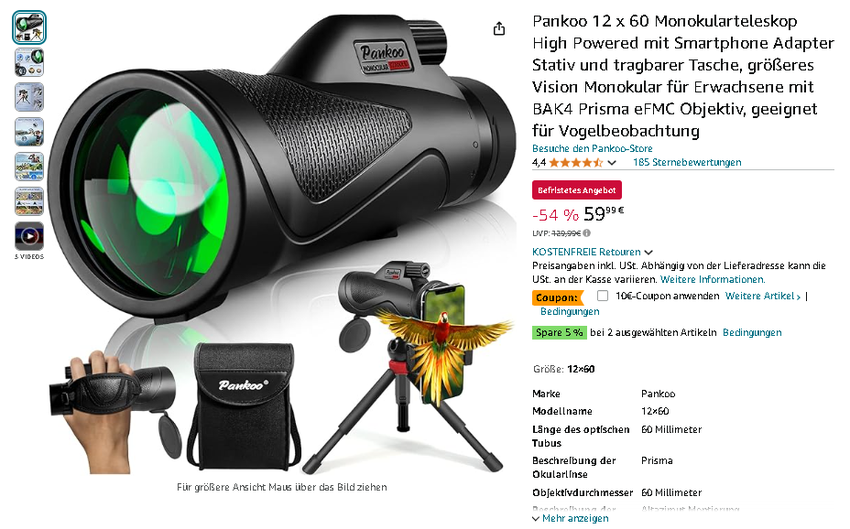 Das Pankoo 12x60 Monokularteleskop ist momentan für 59,99 € verfügbar, herabgesetzt von 129,99 € - das entspricht einer Ersparnis von 54%! Ein Angebot, das Naturbeobachter begeistern wird.