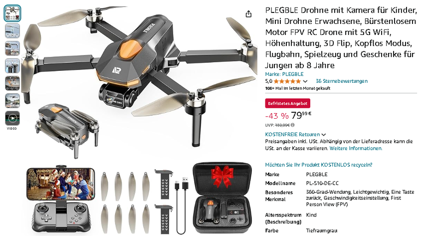 Mit ihrem attraktiven Preis, den fortschrittlichen Funktionen und dem kinderfreundlichen Design ist die PLEGBLE Drohne eine ausgezeichnete Wahl für alle, die in die faszinierende Welt der Drohnentechnologie eintauchen möchten. Dieses Sonderangebot ist zeitlich begrenzt - greifen Sie zu, solange der Vorrat reicht!