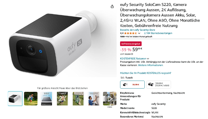 Die innovative eufy SoloCam S220 ist aktuell für 59,99 € statt 99,00 € verfügbar - das entspricht einer beachtlichen Ersparnis von 39%! Ein hervorragendes Angebot für diese Sicherheitskamera.