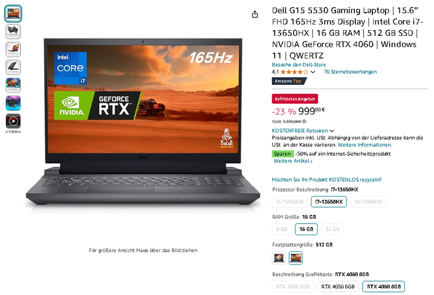 Der Dell G15 5530 Gaming Laptop ist aktuell für 999,00 € erhältlich, reduziert von 1.299,00 € - das entspricht einer Ersparnis von 23%! Ein überragendes Angebot für diese Gaming-Maschine.