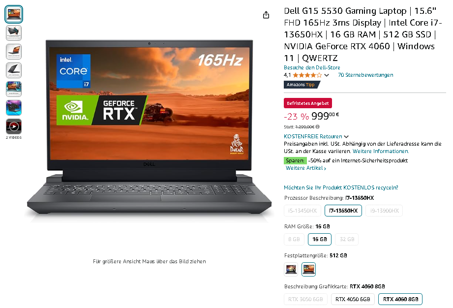 Das Dell G15 5530 ist aktuell für 999,00 € verfügbar, statt 1.299,00 € - ein beachtlicher Rabatt von 23%!