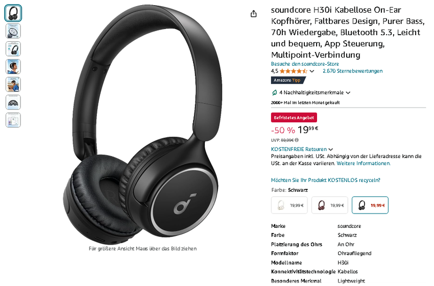 Die Soundcore H30i sind jetzt für nur 19,99 € verfügbar, statt 39,99 € - ein fantastischer Rabatt von 50%!