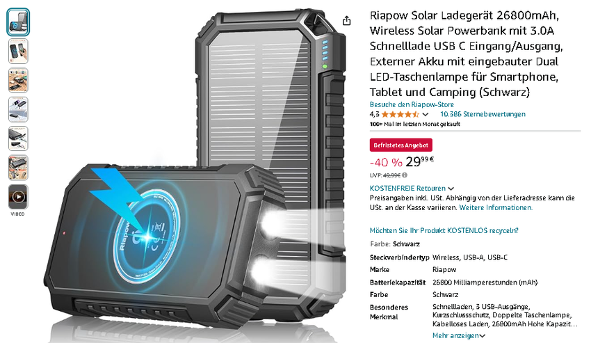 Die Riapow Solar Powerbank ist heute für 29,99 € verfügbar, statt 49,99 € - ein fantastischer Rabatt von 40%!