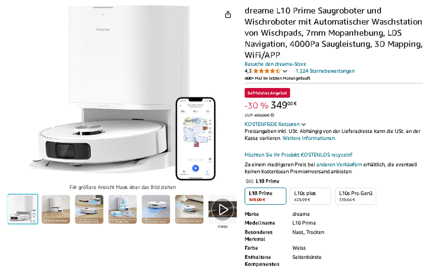 Der Dreame L10 Prime ist heute für 349,00 € verfügbar, statt 499,00 € - eine beeindruckende Ersparnis von 30%!