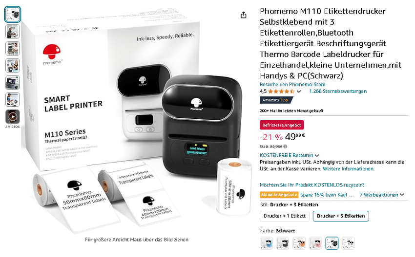 Der Phomemo M110 ist aktuell für 49,99 € verfügbar, statt 62,99 € - das entspricht 21% Ersparnis!