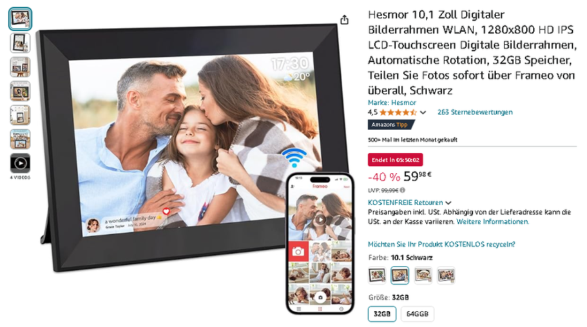 Der vielseitige Bilderrahmen ist momentan für 59,98 € statt 99,99 € verfügbar - ein großzügiger Rabatt von 40%! Die perfekte Gelegenheit, Ihre digitale Fotogalerie zu modernisieren.