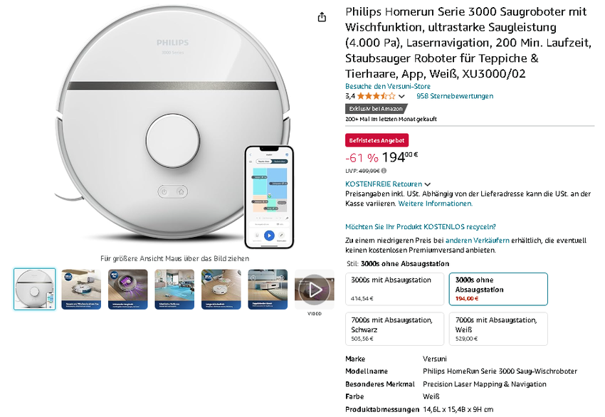 Der leistungsstarke Saug-Wischroboter von Philips ist momentan für 194,00 € erhältlich, statt 499,99 € - eine beeindruckende Ersparnis von 61%! Eine Gelegenheit, die Sie sich nicht entgehen lassen sollten.