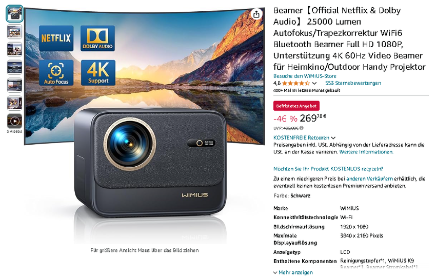Der leistungsstarke Smart Beamer ist aktuell für 269,78 € verfügbar, statt 499,00 € - eine großartige Ersparnis von 46%! Ein Angebot, das Heimkino-Enthusiasten begeistern wird.