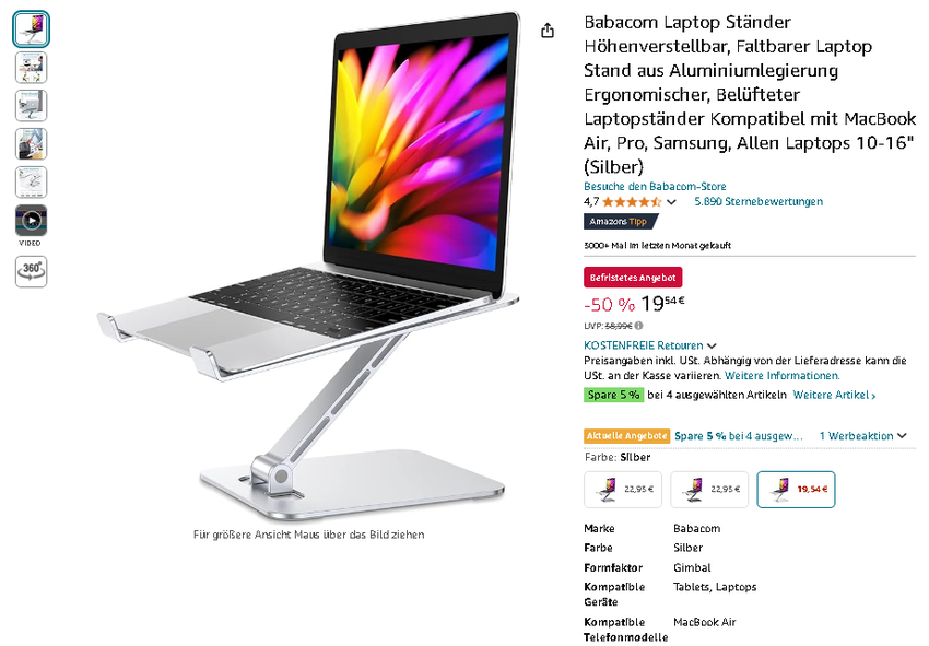 Ein praktisches Angebot erscheint mit dem Babacom Laptop Ständer. Diese ergonomische Halterung revolutioniert Ihren Arbeitsplatz und ist momentan zu einem unwiderstehlichen Preis erhältlich.