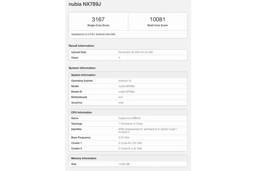 Eines der Modelle mit der Nummer NX789J (vermutlich das Red Magic 10 Pro) tauchte in der Geekbench-Datenbank auf und erzielte 3167 Punkte im Single-Core-Test und 10081 Punkte im Multi-Core-Test. Das Gerät wird von einem Snapdragon 8 Elite-Chip mit zwei Hauptkernen, die mit 4,32 GHz getaktet sind, und sechs Kernen, die mit 3,53 GHz getaktet sind, angetrieben.