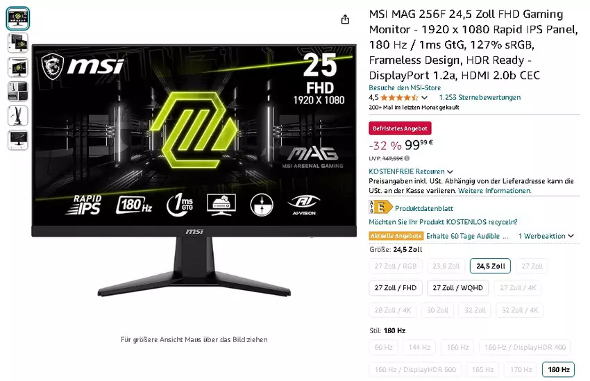 Der MSI MAG 256F Gaming Monitor ist momentan für 99,99 € erhältlich, reduziert von 147,99 € - das entspricht einem Rabatt von 32%! Eine fantastische Gelegenheit für Gaming-Enthusiasten.