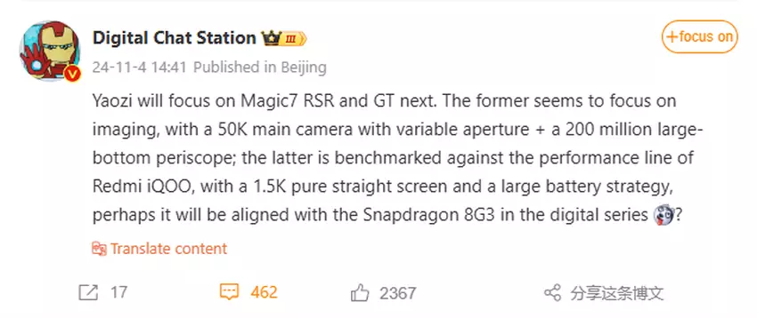 Das Magic 7 RSR wird über eine 50-Megapixel-Hauptkamera mit variabler Blende für optimale Lichtaufnahme, ein 200-Megapixel-Teleobjektiv mit Periskop-Funktion und eine 50-Megapixel-Ultraweitwinkelkamera verfügen. Das Gerät wird voraussichtlich im Dezember 2024 auf den Markt kommen.