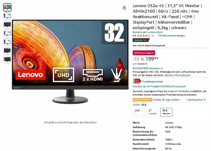 Der Lenovo D32u-45 Gaming Monitor ist aktuell für 199,49 € statt 299,00 € erhältlich - das entspricht einer Ersparnis von 33%! Eine bemerkenswerte Gelegenheit für alle, die nach einem hochwertigen 4K-Display suchen.