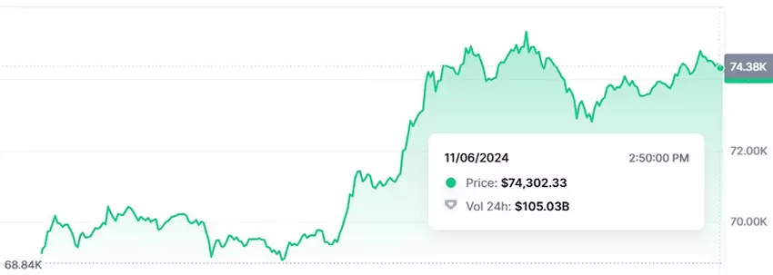 Der Preis der Kryptowährung reagierte sofort auf die Nachricht von Trumps Sieg und überschritt die Marke von 74 700 Dollar.