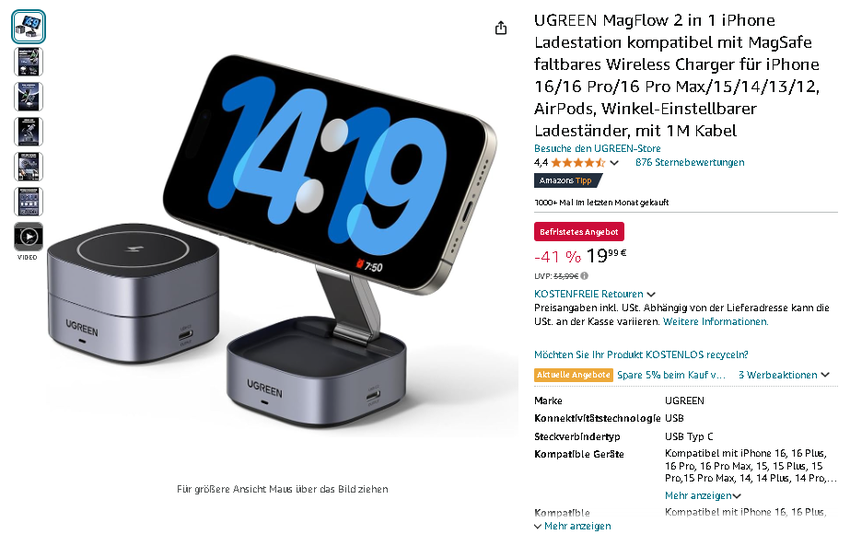 Die vielseitige MagFlow Ladestation ist aktuell für 19,99 € statt 33,99 € erhältlich - das entspricht einer Ersparnis von 41%! Ein überzeugendes Angebot für eine so flexible Ladelösung.