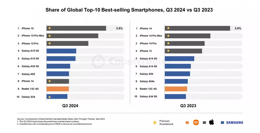 Laut einer Studie von Counterpoint steht das iPhone 15 im dritten Quartal 2024 weltweit an erster Stelle der verkauften Smartphones. Auf den Plätzen zwei und drei folgen seine "Brüder" - iPhone 15 Pro Max und iPhone 15 Pro.
