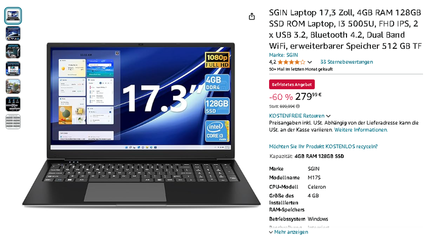 Der leistungsfähige SGIN M17S 17,3 Zoll Laptop ist momentan für 279,99 € verfügbar, reduziert von 699,99 € - eine beeindruckende Ersparnis von 60%! Ein Preishammer, der seinesgleichen sucht.