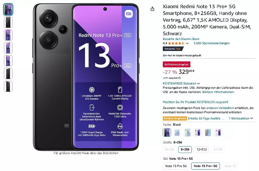 Das Xiaomi Redmi Note 13 Pro+ 5G ist momentan für 329,90 € statt 449,90 € erhältlich - das entspricht einer Ersparnis von 27%! Eine Preisreduzierung, die dieses Top-Smartphone noch attraktiver macht.