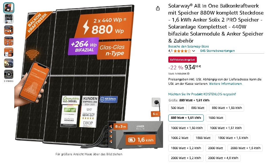 Das Solarway Balkonkraftwerk ist aktuell für 934,99 € statt 1.199,99 € erhältlich - eine Ersparnis von 22%! Ein überzeugender Preis für den Einstieg in die Solarenergie.