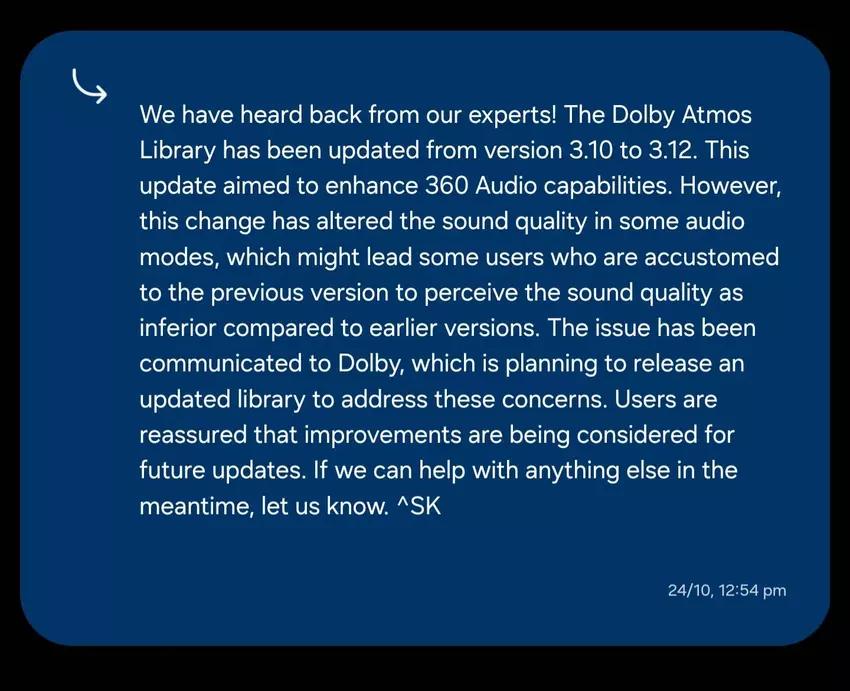 Samsung leugnete das Problem zunächst, doch nach zahlreichen Beschwerden räumte es dessen Existenz ein und erklärte, dass es an einer Lösung arbeite. In einer Erklärung erklärte das Unternehmen, dass das Problem auf ein Update der Dolby Atmos-Bibliothek von Version 3.10 auf 3.12 zurückzuführen sei, das die 360-Audio-Funktion verbessern sollte, aber auch andere Aspekte des Tons betraf.