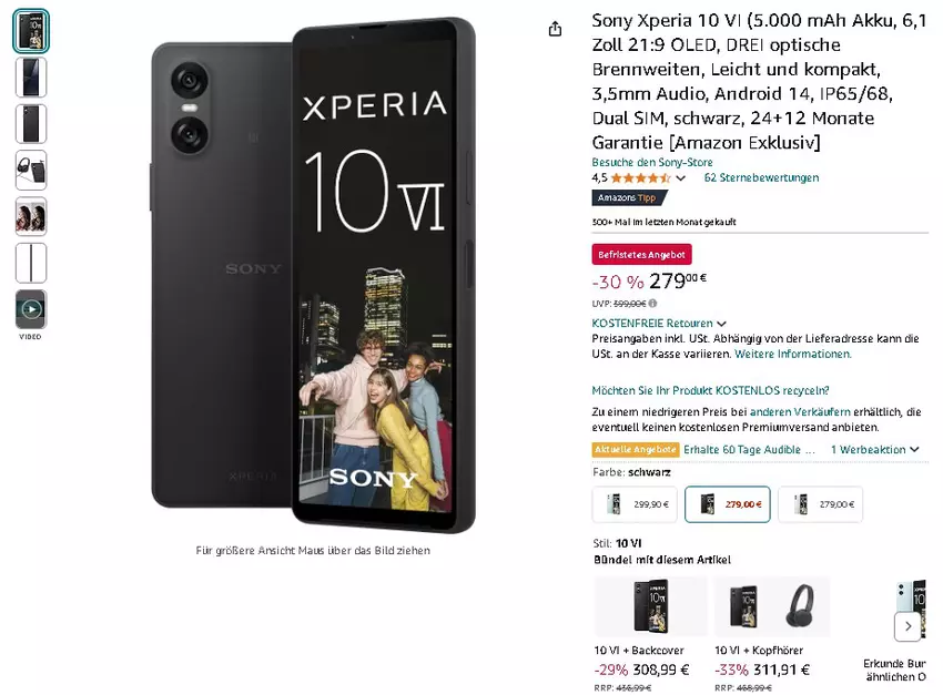 Das Sony Xperia 10 VI ist momentan für 279,00 € statt 399,00 € erhältlich - das entspricht einer Ersparnis von 30%. Ein Angebot, das Technik-Enthusiasten nicht verpassen sollten.