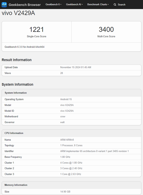 Vor der Markteinführung wurde das Vivo S20-Modell auf der Geekbench-Plattform getestet, wo das Gerät mit der Modellnummer V2429A 1221 Punkte im Single-Core- und 3400 Punkte im Multi-Core-Test erzielte. Nach den technischen Daten zu urteilen, wird das Smartphone von einem Qualcomm Snapdragon 7 Gen 3 Prozessor mit einem 2,63 GHz Hauptkern, drei 2,40 GHz Zwischenkernen und vier 1,8 GHz effizienten Kernen angetrieben.
