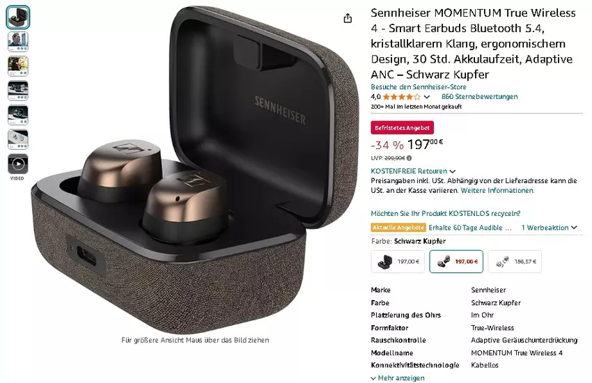 Die neuesten Sennheiser True Wireless Kopfhörer sind jetzt für 197,00 € statt 299,90 € erhältlich - das bedeutet 34% Ersparnis! Ein außergewöhnliches Angebot für Kopfhörer dieser Klasse.