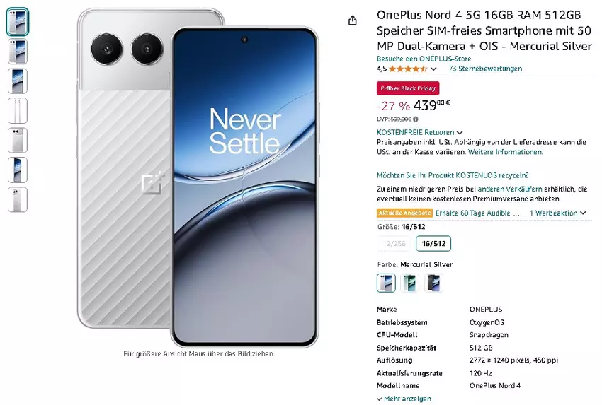 Der leistungsstarke OnePlus Nord 4 5G ist momentan für 439,00 € statt 599,00 € erhältlich - das entspricht einer Ersparnis von 27%! Ein Preis-Leistungs-Verhältnis, das seinesgleichen sucht.
