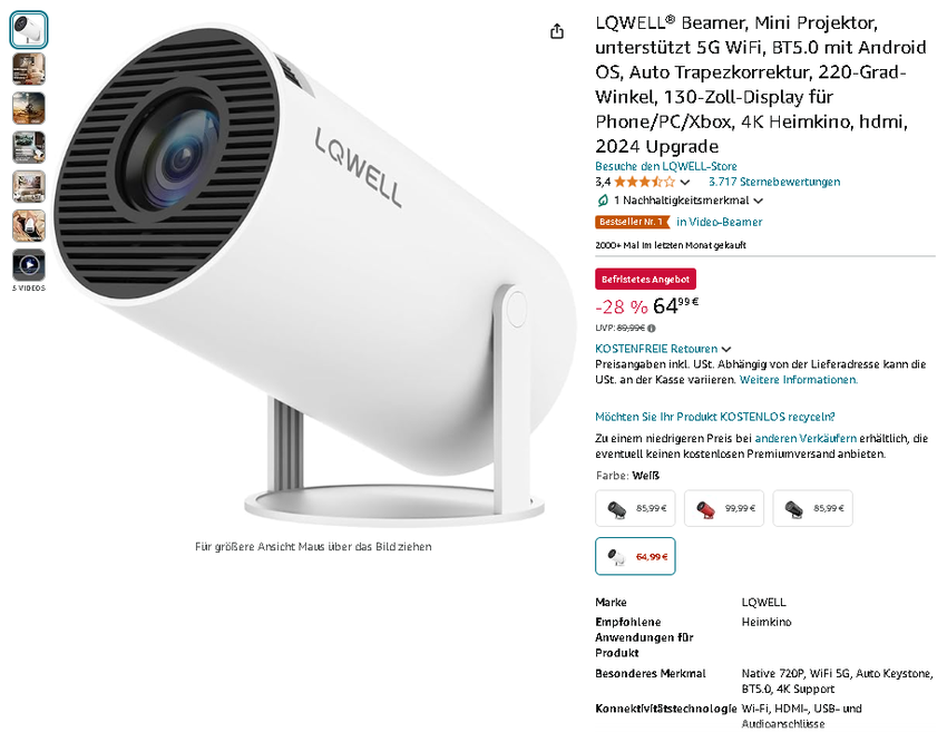 Der innovative LQWELL Mini Projektor ist momentan für 64,99 € statt 89,99 € erhältlich - das entspricht einer Ersparnis von 28%. Ein verlockender Preis für diese technologische Perle.