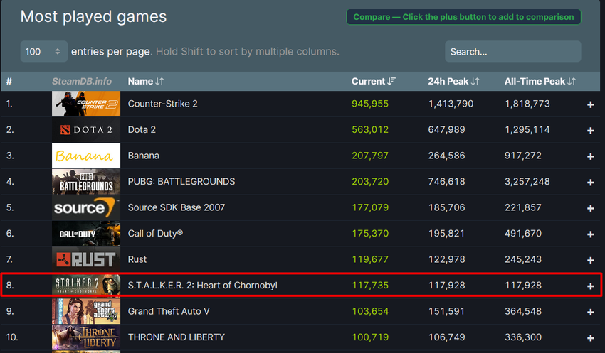S.T.A.L.K.E.R. 2: Heart of Chornobyl vom ukrainischen Studio GSC Game World feierte einen großartigen Einstand auf Steam und schaffte es am Tag der Veröffentlichung in die Top Ten der beliebtesten Spiele auf der Plattform. In der Spitze erreichte die Zahl der gleichzeitigen Spieler 113 Tausend, was die Zahlen der vorherigen Teile der Serie, einschließlich S.T.A.L.K.E.R: Shadow of Chernobyl (2007), deutlich übertrifft.