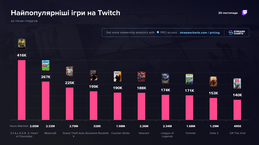 Wir haben geschrieben, dass S.T.A.L.K.E.R. 2 derzeit unter den Top 10 der beliebtesten Spiele auf Steam ist. Gleichzeitig wurde das Spiel am Tag seiner Veröffentlichung, dem 20. November, zum beliebtesten Spiel auf Twitch.