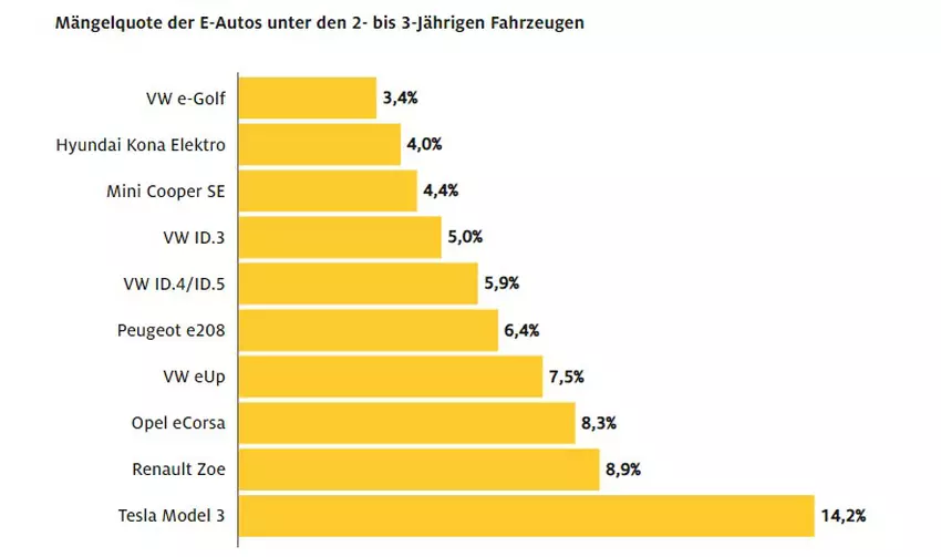 Interessanterweise schnitten Elektroautos, die auf bestehenden Benzinmodellen basieren, besser ab. So wiesen der Volkswagen e-Golf und der Mini Cooper SE deutlich weniger Mängel auf als die Modelle Renault Zoe oder Tesla Model 3, die von Grund auf neu entwickelt wurden.