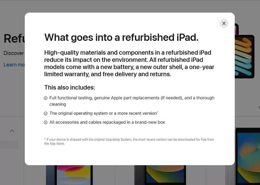 Apple betont, dass generalüberholte iPads mit neuen Akkus und Außengehäusen ausgestattet sind und in neuen Kartons mit Anleitungen und Zubehör verkauft werden, darunter ein USB-C-Ladekabel und ein Netzadapter.